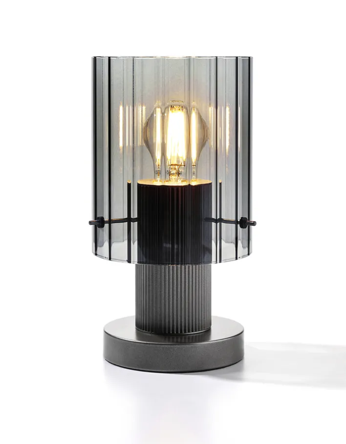 Die casaNOVA Retrofit Tischlampe RONJA ist 38 cm hoch, 15 cm breit und 15 cm tief. Sie ist aus silberfarbenem Metall und Rauchglas und verfügt über einen Ein- und Ausschalter und einen Netzanschluss.