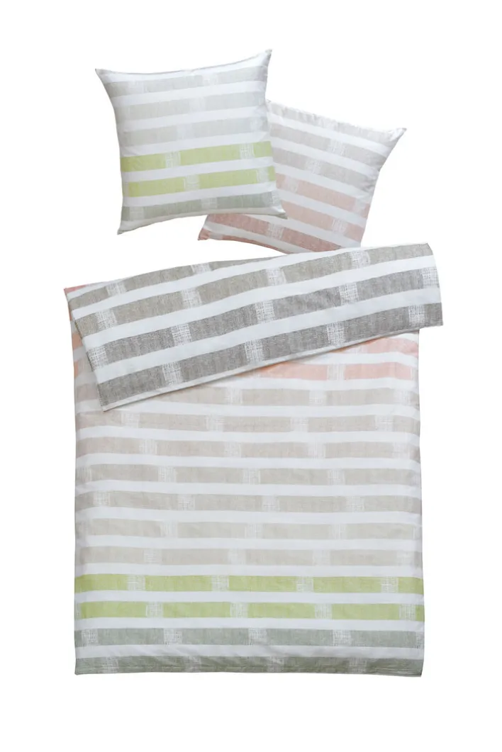 Die kühlenden Eigenschaften der Satin-Bettwäsche HELEN punkten spätestens im Hochsommer. Ganzjährig begeistert hingegen das ansprechende Design: Das hübsche Streifenmuster in dezenten Pastelltönen überzeugt mit Gemütlichkeit, wie für die Marke casaNova üblich. Das Set besteht aus einem Bettbezug in der Größe 135 x 200 cm und einem Kissenbezug mit den Maßen 80 x 80 cm, lässt sich per Reißverschluss schließen, bei bis zu 60 °C waschen und im Trockner trocknen.