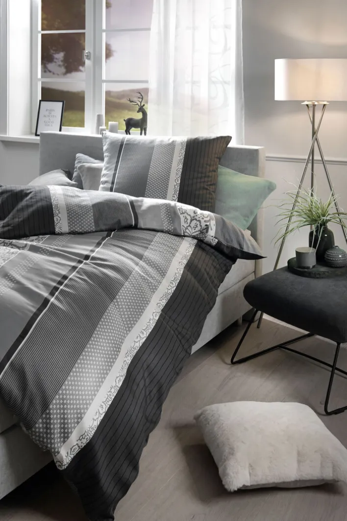Nüchterne Streifen oder lieber verspielte Ornamente? Wer sich nicht entscheiden kann und trotzdem eine stilvoll schlichte Bettwäsche sucht, ist mit der Satin-Bettwäsche JOHANNA von casaNOVA richtig beraten. Die breiten Streifen in hellen und dunklen Grautönen lassen die Bettwäsche polychrom wirken. Das ist modernes Design für Schlafräume, die gerade im Sommer etwas Kühle vertragen können, ohne an Gemütlichkeit einzubüßen! Das glatte Baumwollsatin sorgt auch in schwül-heißen Nächten für einen erholsamen Schlaf.