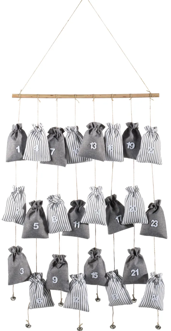 Der Adventskalender ist zum Aufhängen an einer Wand oder Tür bereit. Von einem schmalen Holzstab baumeln 24 kleine Textilsäckchen herab, die jeweils eine Größe von 9,5 x 12,5 cm haben und an dünnen Schnüren sicher befestigt sind. Ein besonderer Blickfang ist das abwechslungsreiche Design mit einem unifarbenen und gestreiften Muster. Der Weihnachtsglanz by casaNOVA Adventskalender kann für jeden Tag im Advent zum Beispiel mit Süßigkeiten, Gebäck und anderen kleinen Dingen befüllt werden.