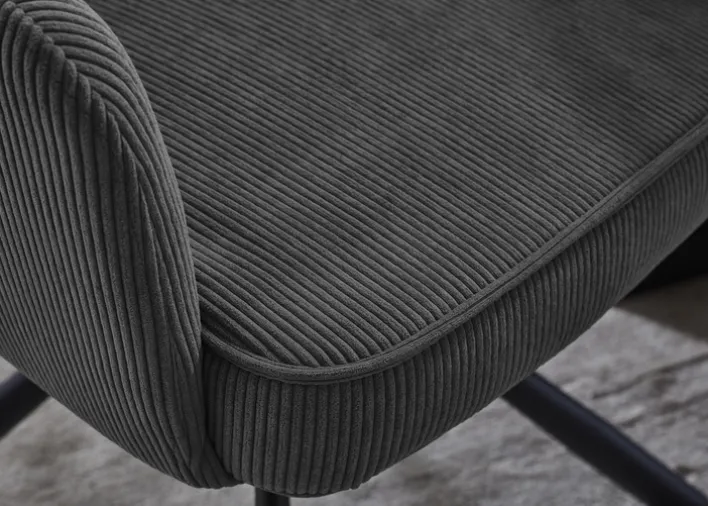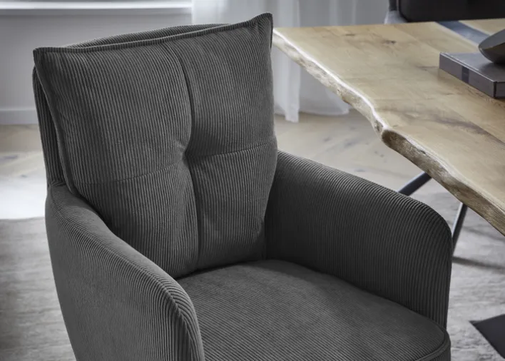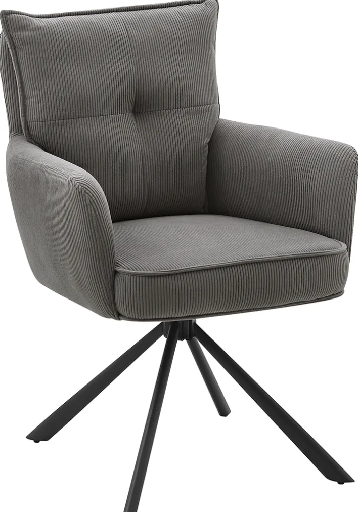 Der Armlehnenstuhl MADRID mit grauem Cordbezug von CASAVANTI schafft nicht nur eine zusätzliche bequeme Sitzgelegenheit, sondern auch ganz viel Gemütlichkeit. Für einen sicheren Stand ist dank dem vierteiligen Sternenfuß gesorgt, der es zudem ermöglicht den Stuhl um 180 Grad zu drehen. Das komplette schwarze Metallgestell wurde mitsamt den Standfüßen pulverbeschichtet.