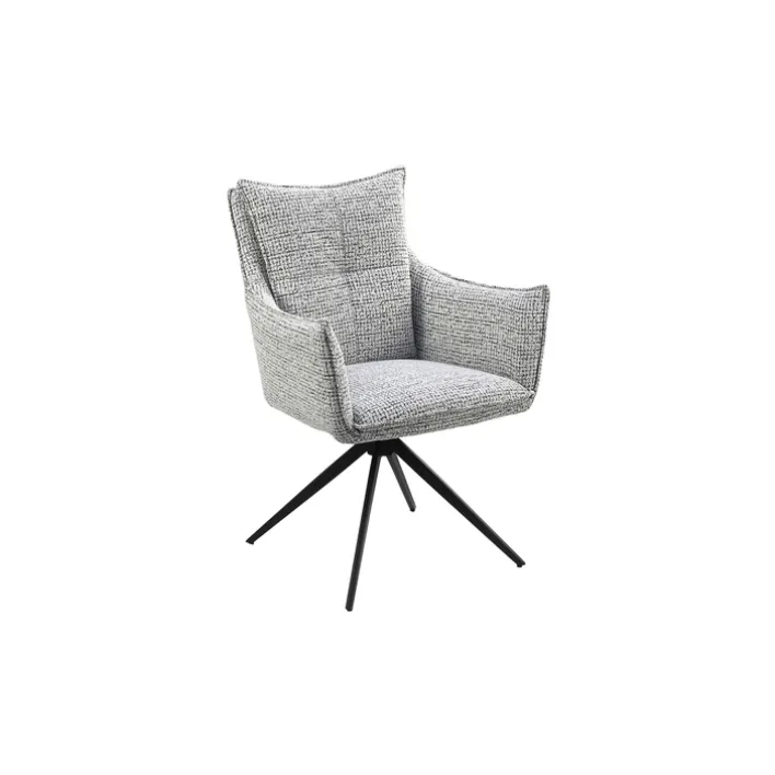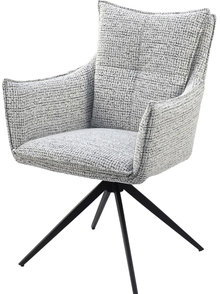 Der Armlehnstuhl aus der Serie MARLENE von Casavanti vereint modernes Design mit hoher Funktionalität. Mit einer Breite von 67 cm, einer Höhe von 91 cm und einer Tiefe von 62 cm bietet er großzügigen Sitzkomfort. Der Stuhl ist drehbar um 360°, was Flexibilität und Bewegungsfreiheit gewährleistet. Die Hauptfarbe des Stuhls ist ein elegantes Hellgrau, das durch die Kombination von grauen und schwarzen Tönen im Textilmaterial eine ansprechende Optik erhält.