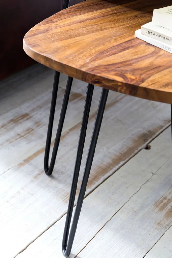 Die Tischplatte besteht aus massivem Holz (Rosenholz Sheesham) und zeigt eine angenehm lebhafte Maserung. Das filigrane Gestell ist aus Eisen gefertigt. Die Beistelltische können einzeln an verschiedenen Stellen platziert werden. Sie sehen aber auch sehr attraktiv aus, wenn der kleinere ein wenig unter den höheren geschoben wird. Beliebte Standorte sind der Stellplatz neben dem Lieblingssessel oder der Couch.