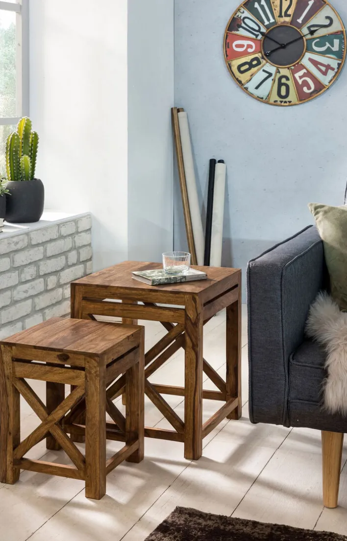 Das CASAVANTI Beistelltisch 2er-Set Sheesham in braun zieht dank seiner ungewöhnlichen Optik die Aufmerksamkeit auf sich. Sein Vierfußgestell mit den kreuzförmigen Streben gibt ihm eine rustikale Optik.