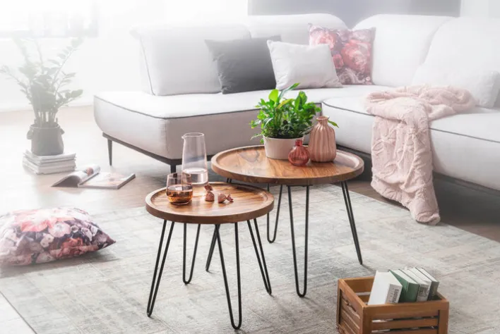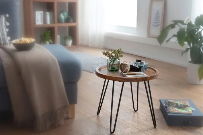 Der Durchmesser der Platte liegt bei 60 cm. Damit ist reichlich Platz vorhanden, wenn eine Tasse, ein Glas und ein Kuchenteller abgestellt werden. Als Beistelltisch kann er neben der Couch oder dem Sessel sowie als Solitär an anderer Stelle stehen. Wird er allein präsentiert, eignet er sich für Dekorationen. Mit seiner attraktiven Optik fällt er sicher ins Auge. Das schmiedeeiserne Fußgestell und die Sheesham-Platte harmonieren perfekt miteinander. Der schicke Tisch wird in Indien gefertigt.