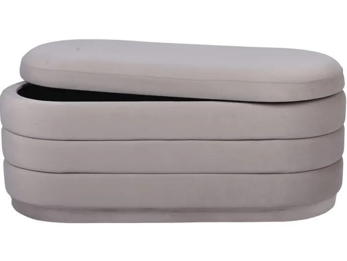 Die Bank bietet eine praktische Ablagefläche sowie integrierten Stauraum durch einen abnehmbaren Deckel. Die Form ist klar oval, was zu vielseitigen Einsatzmöglichkeiten im Schlafzimmer beiträgt. Das Gewicht beträgt 15 kg, was eine solide Standfestigkeit ermöglicht. Die Materialauswahl und die dezente Farbgebung unterstützen ein modernes Wohnambiente.