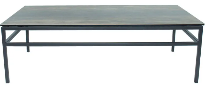Der CASAVANTI Couchtisch misst in Breite und Höhe 120 x 38 cm. Er zeigt eine dunkelbraune Tischplatte als Holznachbildung und ein schwarzes Gestell aus Edelstahl, das pulverbeschichtet ist. Der rechteckige Tisch ist 60 cm tief.