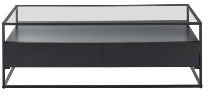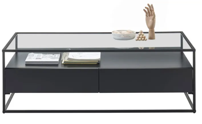 Das stabile Untergestell des rechteckigen Couchtischs ist aus pulverbeschichtetem Metall gefertigt. Die eingelegte Tischplatte besteht aus klarem Sicherheitsglas. Der Unterbau des Tischs mit der Ablage und den Schubkästen ist aus einem Holzwerkstoff hergestellt. Die pflegeleichten Oberflächen sind mehrfach lackiert.
