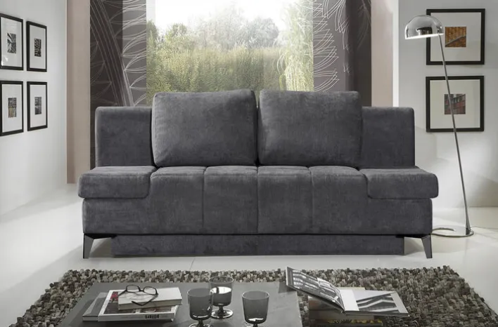Das elegante CASAVANTI Schlafsofa TABBY hat eine Breite von etwa 208 cm und bietet einen ausgezeichneten Schlafkomfort. Mit seinem modernen Look und Polstern in der Farbe grau lässt der 3-Sitzer zahlreiche Gestaltungsmöglichkeiten zu und ist problemlos in bereits bestehende Raumkonzepte integrierbar. Die Liegefläche mit Taschenfederkern hat eine Größe von 150 x 200 cm. Für Decken und Kissen ist das Schlafsofa zusätzlich mit einem Bettkasten ausgestattet.