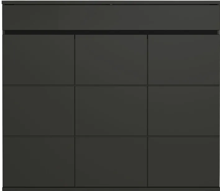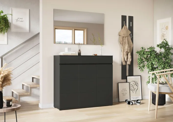 Bei dem Schuhschrank LANDOS von CASAVANTI im Graphit-Farbton finden auf 136 x 120 cm all die schönen Sommer- und Winterschuhe ihren rechten Platz – dort sind sie bis zum nächsten Einsatz zugleich vor Staub geschützt. Seine massive Formsprache eignet sich insbesondere für größere Flur- und Eingangsbereiche, die Oberseite könnte als Präsentationsfläche für Deko-Stücke dienen.