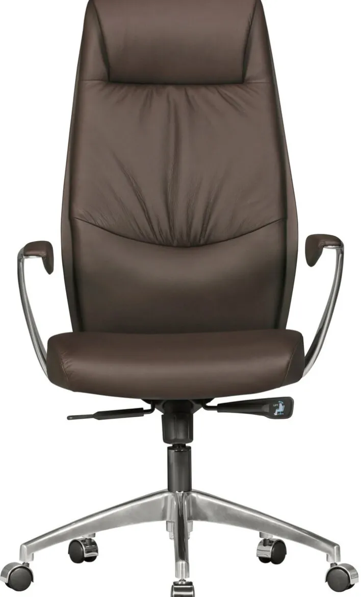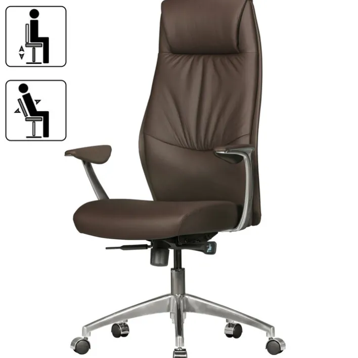 Der Chefsessel hat eine Größe von 76 x 125 x 58 cm. Er lässt sich in der Sitzhöhe von 44 cm auf maximal 53 cm verstellen und ist perfekt an die Höhe des Schreibtisches anpassbar. Dank Fußkreuz mit robusten Doppelrollen ist der Schreibtischsessel zudem mit einem Gewicht von maximal 120 kg belastbar. Das silberfarbige Fußkreuz vereint der Chefsessel mit einem eleganten Ledersitz in Braun. Dieser ist mit einer Synchronmechanik ausgestattet und ist drehbar.