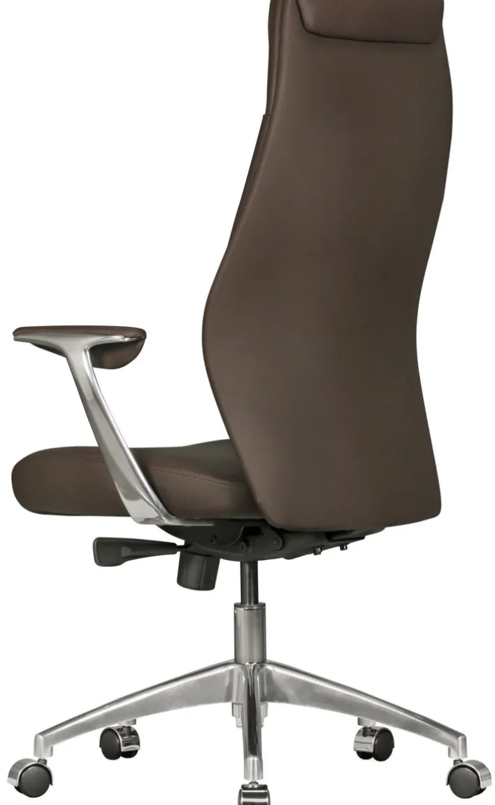 Der braune Chefsessel inklusive Rollen erstrahlt in einem eleganten Look, der sich in viele bestehende Wohnräume integrieren lässt. Mit seinem komfortabel gepolsterten Sitz sorgt er zudem den ganzen Tag für einen hohen Sitzkomfort.