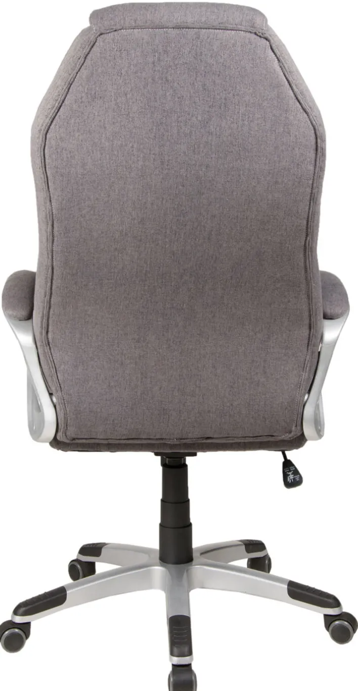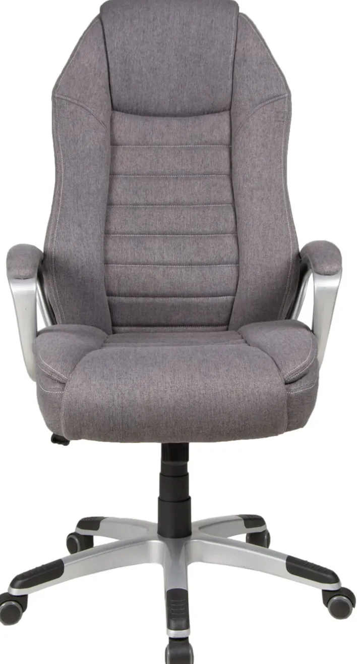 Sitz und Rückenlehne sind aufwendig gearbeitet und formen ergonomische Flächen, die den Rücken und Kopf gut stützen. Der graue Textilbezug hat eine feine Struktur, fühlt sich gut an und ist pflegeleicht. Farblich passend sind die Armlehnen aus gebürstetem Metall und Stoff. Der höhenverstellbare Chefsessel DIRK lässt sich zwischen 49 und 57 cm einstellen. Die maximale Gesamthöhe beträgt 124 cm. Die Kippmechanik lässt sich individuell einstellen oder schwingt frei. Und der Sternfuß mit den leicht laufenden Kunststoffrollen, das mit schwarzen Elementen abgesetzt ist.