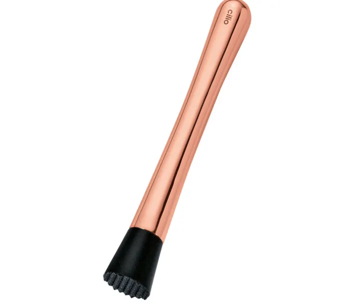 Der in den Farben Kupfer und Schwarz designte Caipirinha-Stößel von cilio hat eine Höhe von 20,5 Zentimetern. Der Durchmesser des nur 0,09 Kilogramm leichten Utensils für die Bar misst 3,4 Zentimeter. Das Modell überzeugt wegen seiner schlanken Form und der Farben mit einer eleganten Optik.