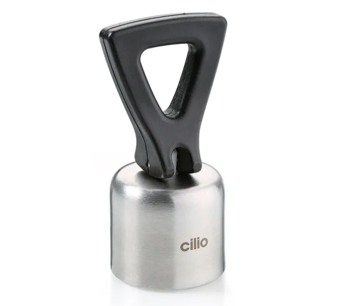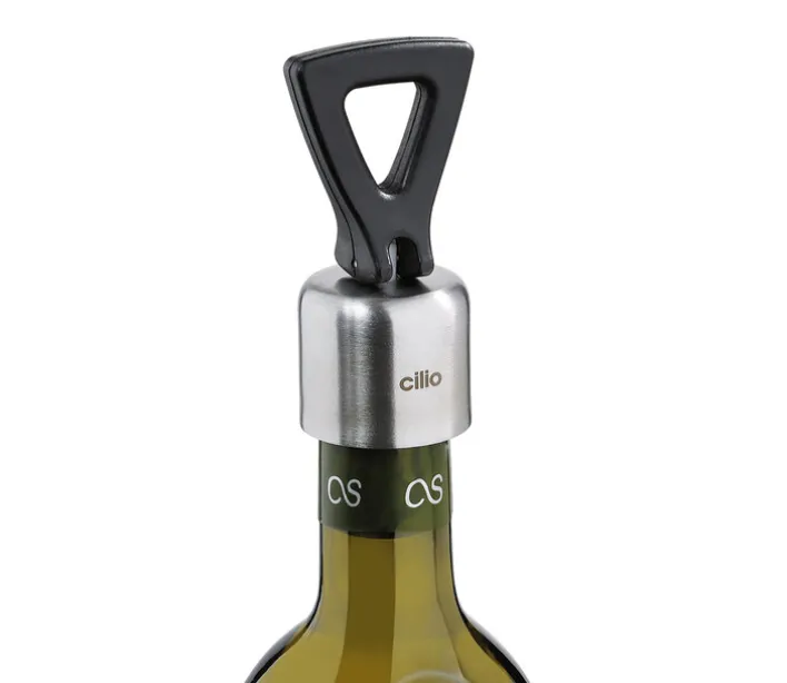 Die Verschlusskappe des cilio Weinflaschenverschlusses LEVA wird aus hochwertigem Edelstahl hergestellt. Der ästhetische Glanz dieses soliden Materials fügt sich harmonisch in das Design vieler Kühlschränke und Kücheneinrichtungen ein. An der Kappe aus Metall ist ein Hebel aus schwarzem Kunststoff befestigt. Mit diesem lässt sich der Flaschenverschluss auf einer geöffneten Flasche so arretieren, dass der Flascheninhalt luftdicht von der Atmosphäre außerhalb der Flasche abgeschirmt werden kann. So behält der edle Tropfen dank dem cilio Weinflaschenverschluss LEVA sein originales Aroma für den Genuss zu einem etwas späteren Zeitpunkt.