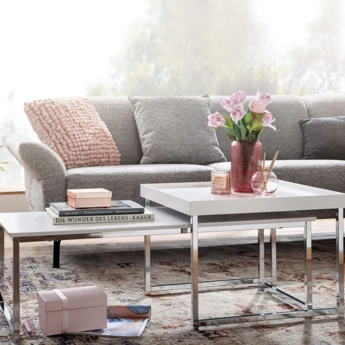 Der 2-teilige Couchtisch präsentiert sich in einem zeitlosen Weiß in Hochglanz und mit einem silberfarbige Metallgestell. Ein besonderes Highlight bietet das Tischset mit der flexiblen Stellbarkeit, wodurch sich bei Bedarf größere Ablage- beziehungsweise Stellflächen ergeben und der Tisch der Couchform anpassbar ist.