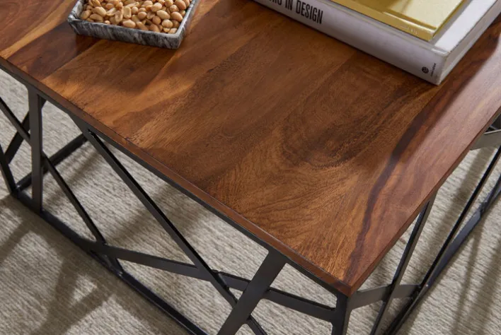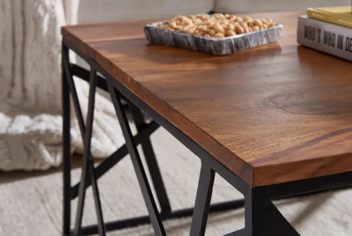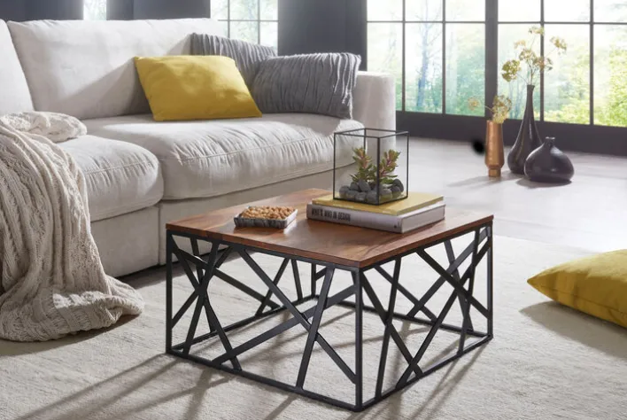 Der quadratische Couchtisch 60 x 60 cm braun/ schwarz ist 35 cm hoch und wiegt 16 kg. Seine maximale Belastbarkeit beträgt 50 kg. Das extravagante Metallgestell, auf dem eine massive Sheesham Tischplatte thront, macht das Möbelstück zu einem Blickfang im Raum. Die Metallverstrebungen harmonieren perfekt mit urbanen und Industrial-Wohnstilen.