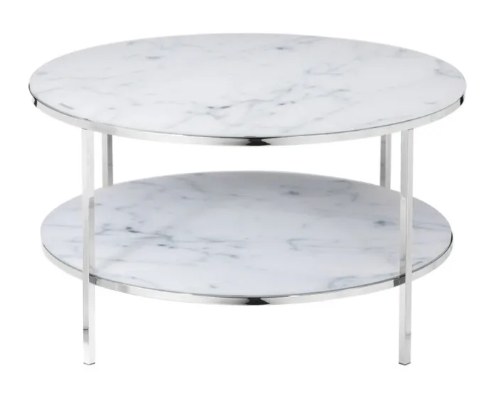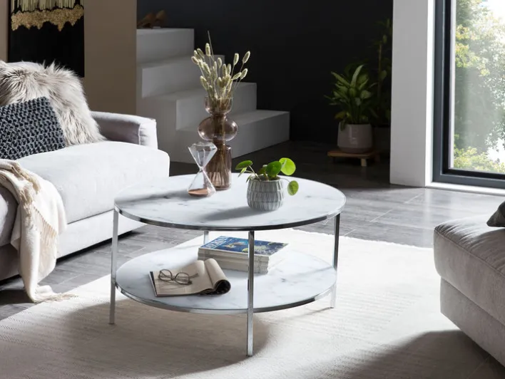 Den Rahmen für eine leichte Optik bei hoher Stabilität bilden beim Couchtisch zwei Metallreifen an vier durchlaufenden Tischbeinen in glänzender Chromoptik. In den Reifen liegt jeweils eine hitzebeständige Glasplatte, in Marmoroptik foliert. Die Ablageflächen sind weit genug, um Zeitschriften, Fernbedienung und Snackschalen oder andere Utensilien im Wohnbereich bequem aufzunehmen. Getränkeflecken und feuchte Speisereste lassen sich von den folierten, glatten Flächen einfach wegwischen. Insgesamt sind beide Materialien langfristig pflegeleicht und farbschön.