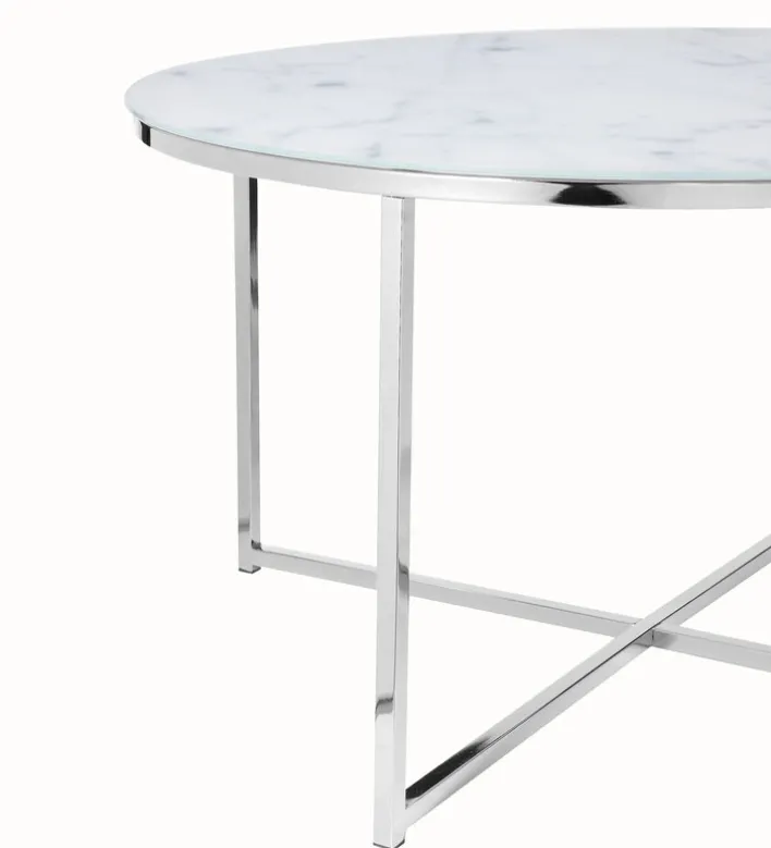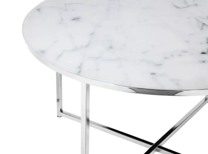 Dieser runde Couchtisch 80 x 80 cm in Weiß/Chrom vereint modernes Design und Funktionalität. Die 6 mm starke Glasplatte mit unterliegender Folie in Marmoroptik passt perfekt zum Vierfußgestell aus Metall in glänzendem Chrom.