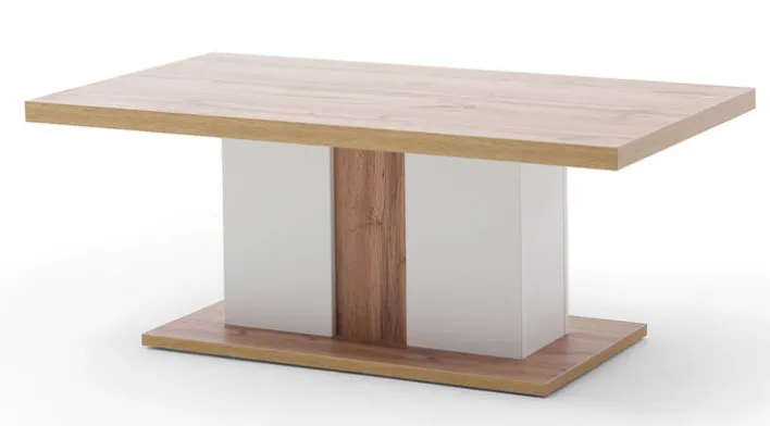 Es ist aus Wotan Eiche in Holznachbildung gefertigt sowie äußerst sorgfältig verarbeitet und zeichnet sich durch sein Säulengestell aus. Der Couchtisch bietet die Möglichkeit zur Ablage von Snacks. Getränken und TV-Equipment. Außerdem lässt er sich zu Dekozwecken nutzen.
