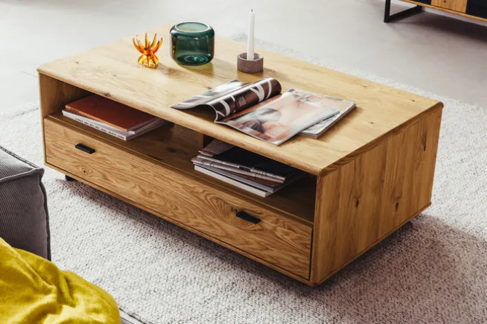 Mit seinem naturbelassenen Holzdesign ist der Couchtisch ein schöner Blickfang in einem modernen Wohnzimmer. Auch zum Scandi-Look oder dem Landhausstil ergänzt er sich auf interessante Weise. Stauraum bietet sich dank einer Einlegeplatte mit zwei geteilten Fächern sowie einem großen Schubkasten mit zwei schwarzen Griffen. Funktional sind die Rollen, dank denen der Couchtisch AREZZO Wildeiche flexibel im Raum verschiebbar ist.