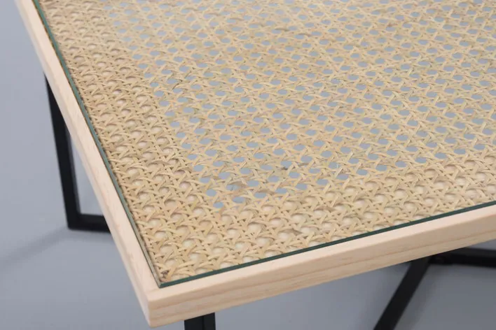 Der rechteckige Couchtisch BRODY kombiniert das moderne, schwarze Vierfußgestell mit einer beigen Tischplatte mit Geflecht und einer Auflage aus 4 mm dickem, klarem Sicherheitsglas. Mit seinem stilvollen Design passt der Sofatisch auch zu Möbeln im Landhausstil, besonders gut harmoniert er jedoch mit einer Einrichtung im Boho Design. Die Tischplatte misst ganze 106 x 60 cm und bietet nicht nur ausreichend Platz für Getränke und Snacks, auch für Karten- und Brettspiele ist sie groß genug.