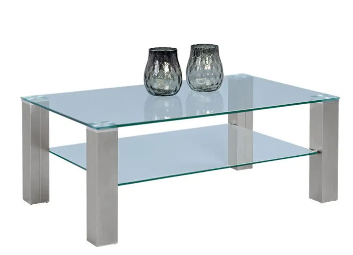 Die Tischplatte wird von vier tragfähigen Tischfüßen aus Edelstahl sicher gehalten. Auf halber Höhe des Gestells ist der Zwischenboden innenliegend fest verankert. Gegenstände auf der unteren Ablagefläche sind aufgrund der Durchsichtigkeit der Tischplatte schnell auffindbar. Der Couchtisch KEVIN vereint hochwertige Materialien und ein puristisches Design. Die edle Materialkombination aus Metall und Glas verleiht dem Tisch eine schlichte Eleganz. Das korrosionsbeständige Gestell aus gebürstetem Edelstahl besitzt eine feine Oberflächenstruktur mit mattem Glanz. Aufgrund seiner dezenten Farbgebung passt der Couchtisch sehr gut in modern eingerichtete Wohnzimmer.