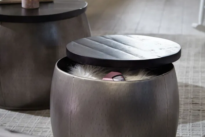 Die Sockel der in Indien hergestellten Couchtische bestehen aus lackiertem Eisen. Bei den Tischplatten handelt es sich um schwarzes Mango-Massivholz. Die Platten lassen sich leicht abnehmen, um die metallischen Innenräume nach Belieben zu füllen. Geschlossen lassen sich die Tische als Ablageflächen und Deko-Objekte verwenden.