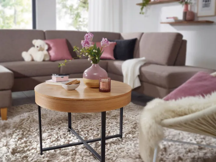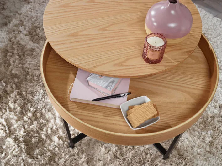 Dieser runde Couchtisch mit den Maßen 69 x 50 cm beeindruckt durch seine zeitlose Eleganz. Das in Schwarz gehaltene Gestell des Tisches harmoniert farblich perfekt mit der Oberfläche in Holzoptik und sorgt durch seine Beschaffenheit für einen stabilen Stand.