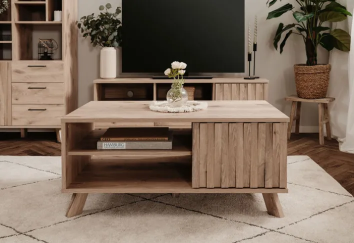 Mit seinem hellen Holzdesign und dem zeitgemäßen Charakter ergänzt sich der Couchtisch von QUARTIER gut zu einer Couchecke im skandinavischen Stil. Er ist gleichermaßen ein Hingucker in einem modern eingerichteten Wohnzimmer. Ein schöne Besonderheit ist das geriffelte Design der beiden Klapptüren, die viel Stauraum bieten.