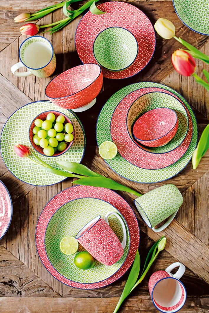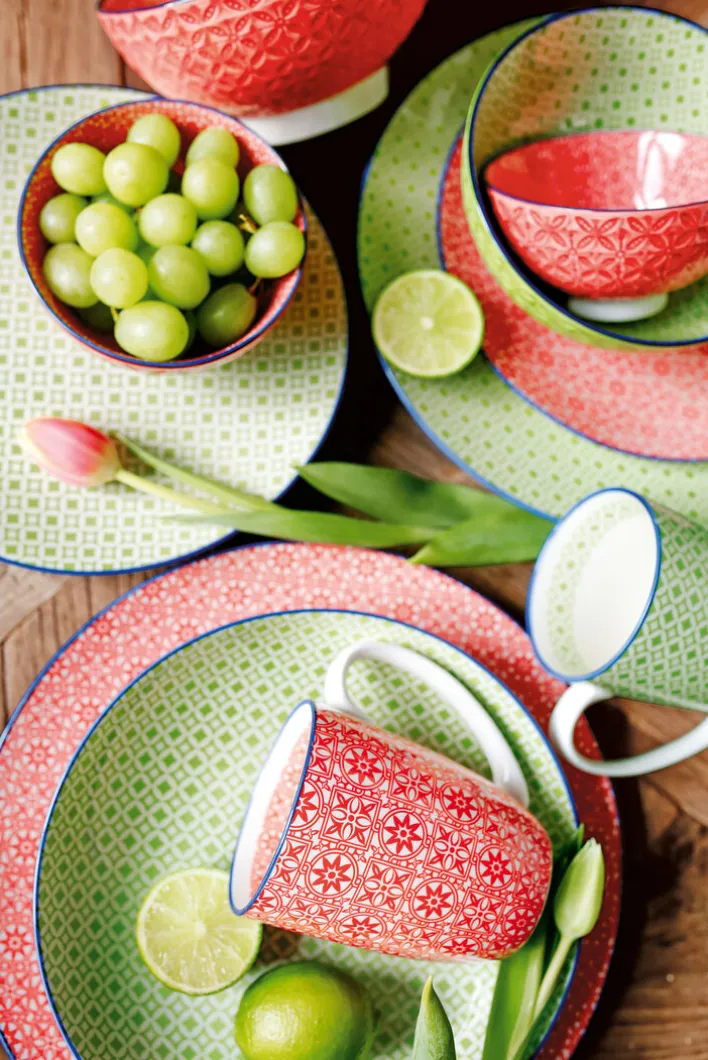 Dieser Kaffeebecher aus der Serie MEDITERRAN von CreaTable besteht aus Keramik und hat eine runde Form. Die Hauptfarbe ist ein helles Grün mit einem dezenten, geometrischen Muster, das sich gleichmäßig über die gesamte Außenfläche zieht. Der obere Rand ist durch eine schmale, kontrastierende Linie in Dunkelblau abgesetzt, was einen klaren Abschluss bildet und das Design unterstreicht.