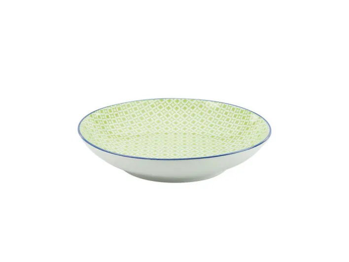 Die variable Geschirr Serie MEDITERRAN, hier der einundzwanzig Zentimeter große Suppenteller in Grün mit einem zarten Muster, bringt mediterranes Flair auf Ihren Tisch. Diesen schönen, tiefen Teller MEDITERRAN können Sie auch wunderbar als Salatteller nutzen. Das hochwertige Steinzeug ist spülmaschinen- und mikrowellenfest. Sie erhalten in Ihrem Online Shop die einzelnen Geschirr Teile der Serie MEDITERRAN in Rot, Blau oder Grün, so dass Sie alle Teile ganz nach Ihrem Geschmack untereinander und miteinander kombinieren können.
