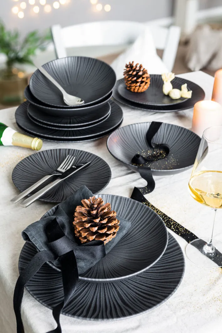 Das exquisite Service VESUVIO beeindruckt mit einem plastisch wirkenden Dekor in Schwarz, das durch seine Zentriertheit an den Kegel eines Vulkans erinnert. Trotz seiner charakteristischen Gestaltung lässt es die Speisen hervorragend zur Geltung kommen. Das adrette casaNOVA Tafelservice VESUVIO besteht aus 4 Suppentellern, 4 Speisetellern und 4 Desserttellern, ist schlagfest, pflegeleicht, mikrowellen- und spülmaschinengeeignet.