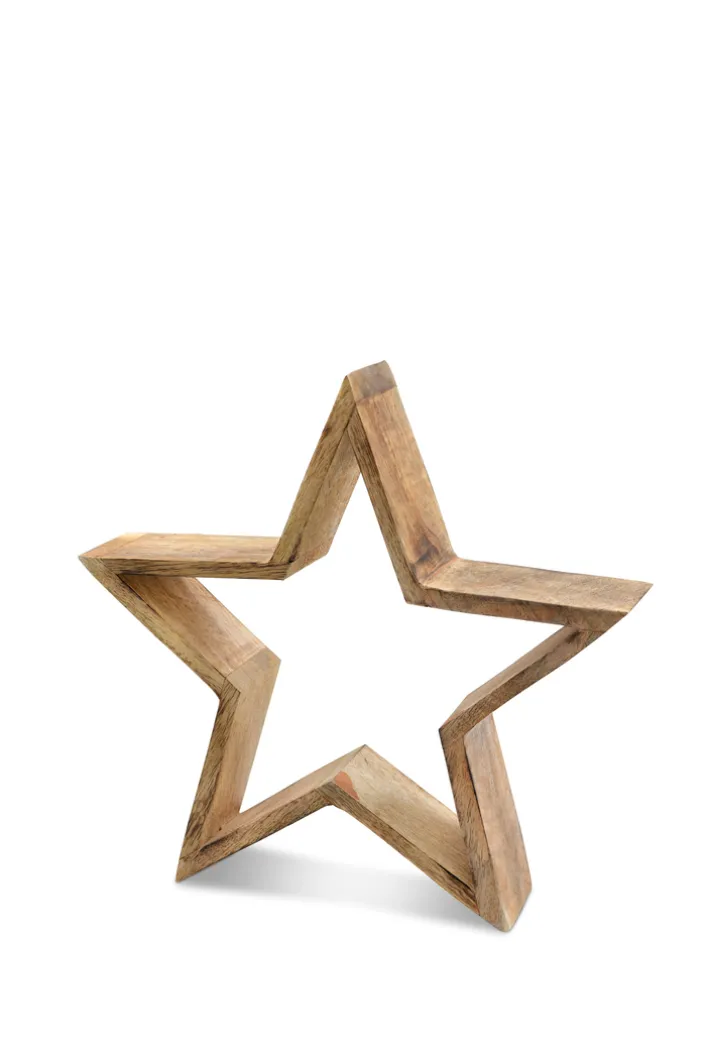 Das Deko Objekt aus der Serie BLACK FORREST präsentiert sich in Form eines fünfzackigen, offen gestalteten Sterns. Es besteht aus massivem Mangoholz, das in einem natürlichen Braunton gehalten ist. Die Oberfläche zeigt eine sichtbare Holzmaserung, die dem Objekt einen authentischen und natürlichen Charakter verleiht.