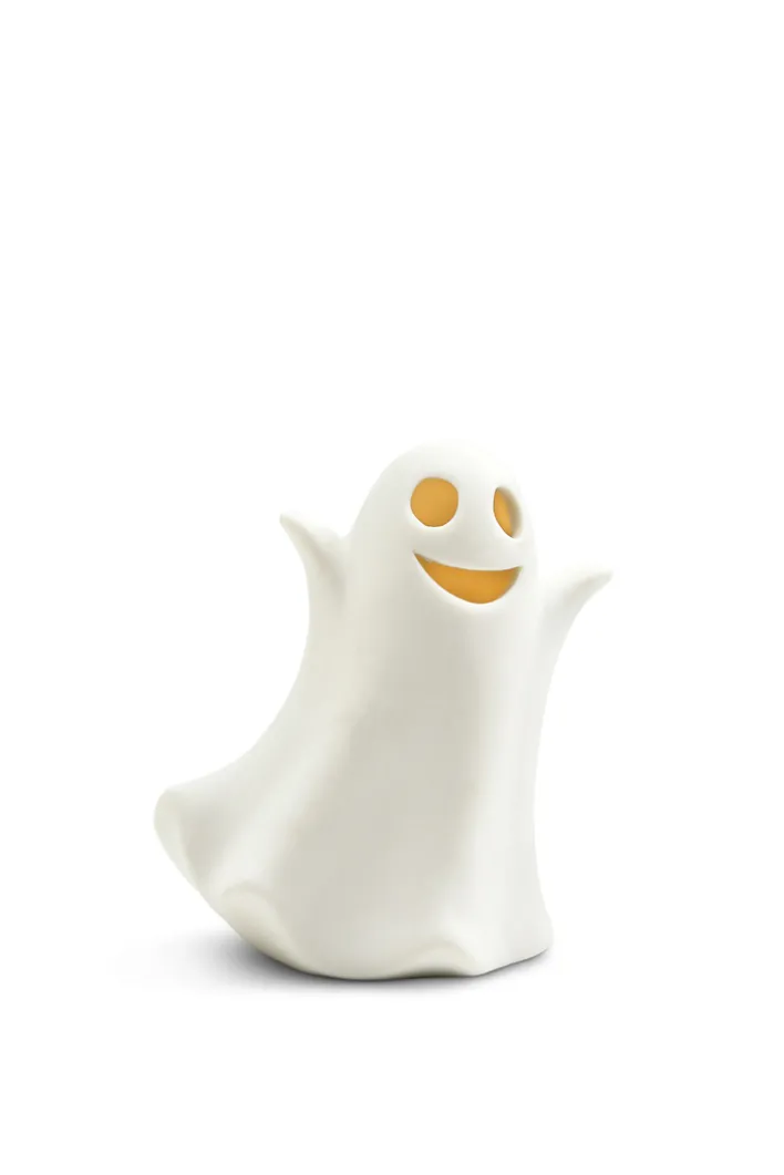 Die Dekofigur in Form eines freundlich gestalteten Geistes präsentiert sich in der Hauptfarbe Weiß und eignet sich für den Innenbereich, insbesondere das Wohnzimmer. Mit kompakten Maßen von 6,5 cm Tiefe, 7,8 cm Breite und 8,8 cm Höhe passt sie problemlos auf Regale, Sideboards oder Fensterbänke.