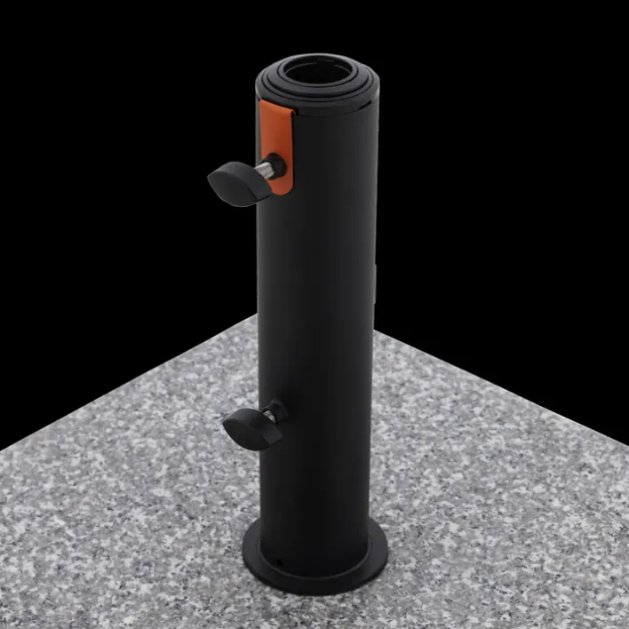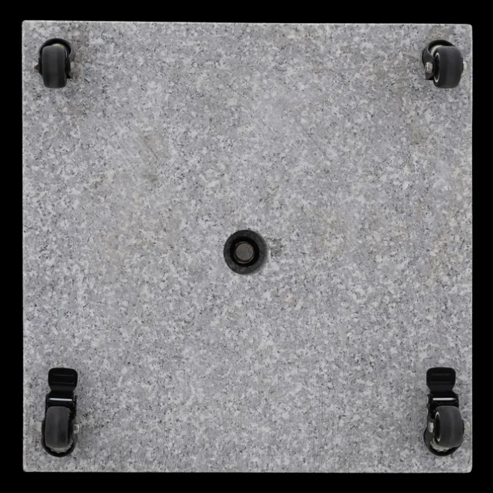 Der doppler Sonnenschirmständer myZONE aus Granit, Edelstahl und Kunststoff ist 45 cm breit und 45 cm tief. Er ist insgesamt 43,5 cm hoch und verfügt über 4 feststellbare Rollen und unterschiedliche Reduziereinsätze für verschiedene Schirmmodelle.