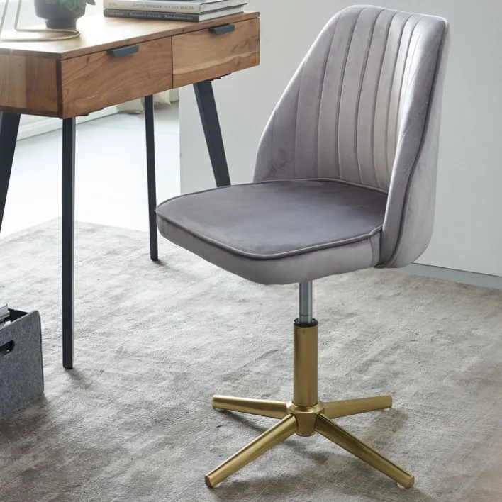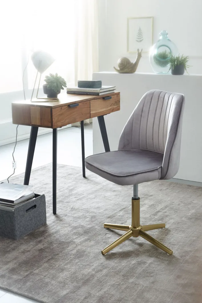 Der Drehstuhl grau/ goldfarbig im Retrodesign kann bis 120 Kilogramm Körpergewicht belastet werden. Er misst mit Rückenlehne 100 cm, ist 47 cm breit und 46 cm tief. Die Sitzhöhe kann auf 40 bis 60 cm eingestellt werden.