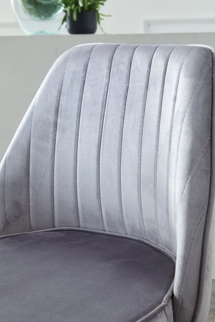 Ohne Rückenlehnen bietet der graue Drehstuhl mit goldfarbigem Metallgestell Sitzplatz auf 47 x 44 cm. Der graue Textilbezug im Streifendesign hat eine raue Oberfläche, ganz im Wohnstil der 1960er Jahre. Durch die Möglichkeit der Rundumdrehung ist der Stuhl flexibel wie ein moderner Bürodrehstuhl und bequem wie ein nostalgisches Sitzmöbel. Der Samtbezug ist schmutzabweisend und abriebfest, das Metallgestell in goldiger Oberflächenveredelung korrosionsbeständig und dauerhaft stark tragfähig.