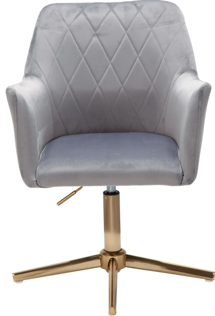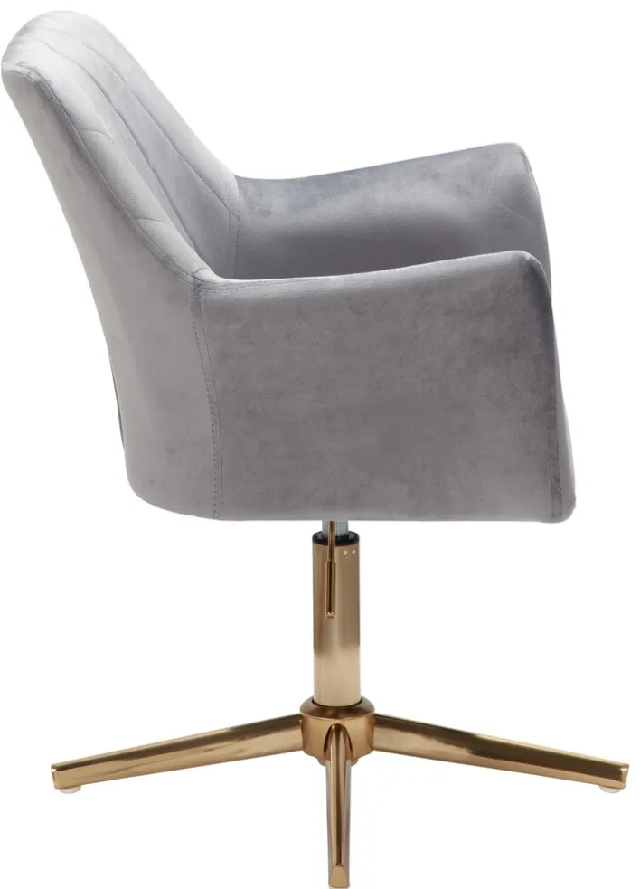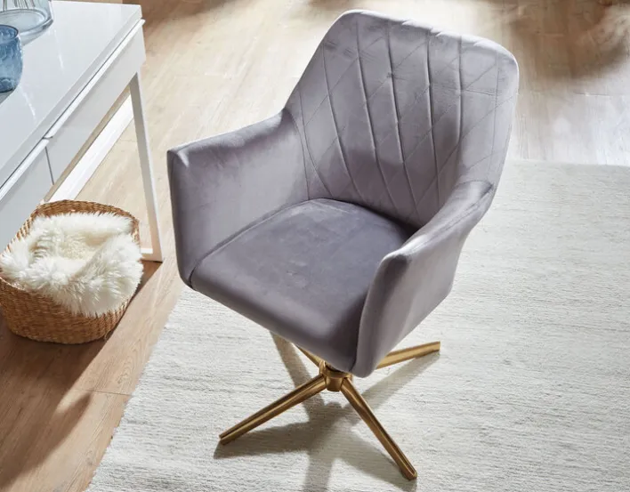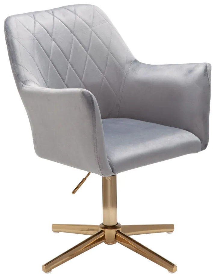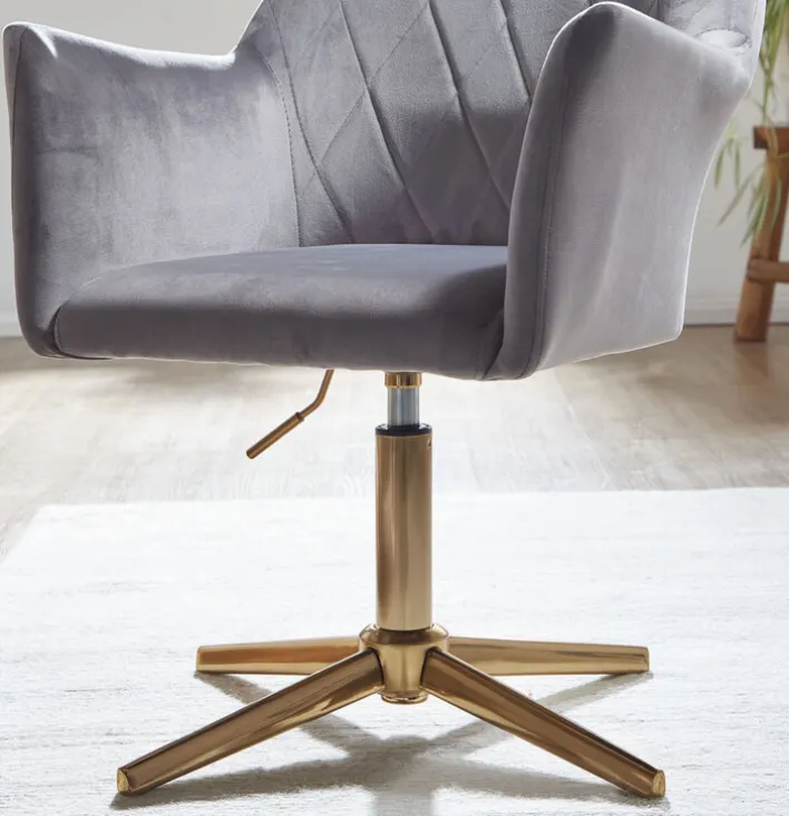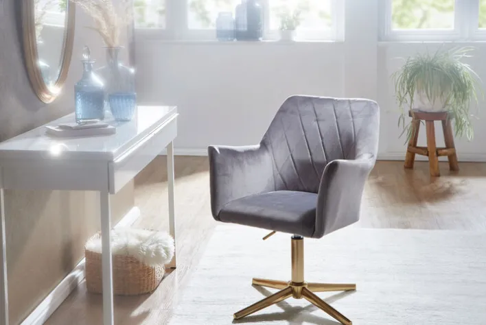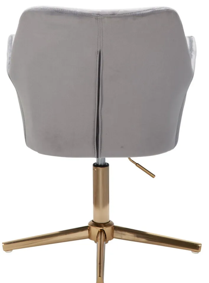 Der Drehstuhl misst 55 x 97 x 55 cm und lässt sich mit bis zu 120 kg belasten. Sein goldfarbig lackiertes Gestell mit Fußkreuz vereint er mit einem bequemen Sitz mit Samtbezug. Der graue Samtbezug mit Rautensteppung an der Rückenlehne schenkt dem Drehstuhl seinen edlen Look. Darüber hinaus bietet der Bezug eine komfortable Haptik. Ein weiterer Pluspunkt ist die verstellbare Sitzhöhe von 35 cm auf maximal 52 cm.