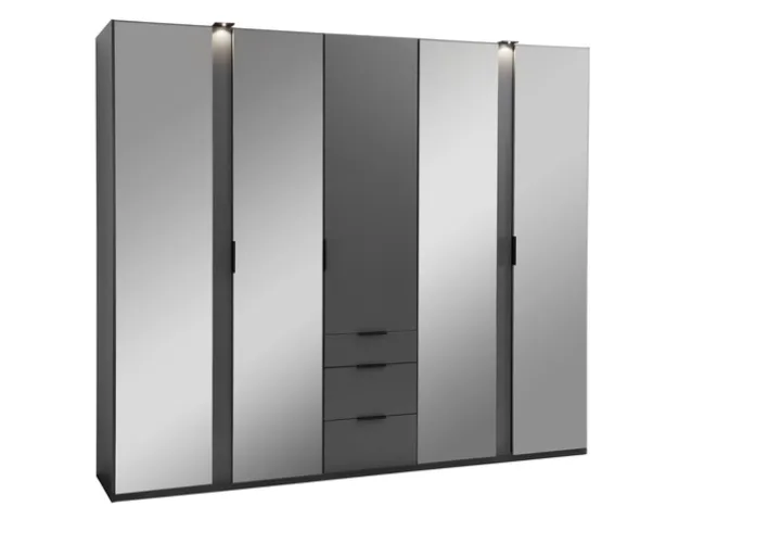Der Drehtürenschrank aus der Serie LA RIOJA bietet eine moderne und funktionale Lösung für Ihr Schlafzimmer. Mit einer Breite von 250 cm, einer Höhe von 216 cm und einer Tiefe von 58 cm bietet er großzügigen Stauraum. Der Schrank ist in einem eleganten Graphitfarbton gehalten, der durch die Kombination von Holznachbildung und Spiegelglas eine stilvolle Optik erhält. Die fünf Drehtüren, von denen einige mit Spiegelglas versehen sind, verleihen dem Raum eine offene und helle Atmosphäre.