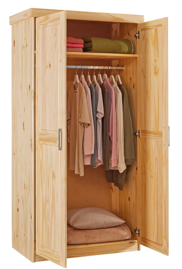 Mit seinen Maßen von 95 x 190 cm passt der VINCENT Schrank auch in kleinere Räume und bietet dennoch genügend Platz für Kleidung, Bettwäsche und mehr. Das schlichte, braune Finish verleiht diesem Schrank ein zeitloses und elegantes Erscheinungsbild, das zu verschiedenen Einrichtungsstilen passt. Die Drehtüren ermöglichen einen einfachen Zugang zu Ihrem Kleiderschrank und sorgen dafür, dass Ihre Kleidung gut geordnet bleibt.