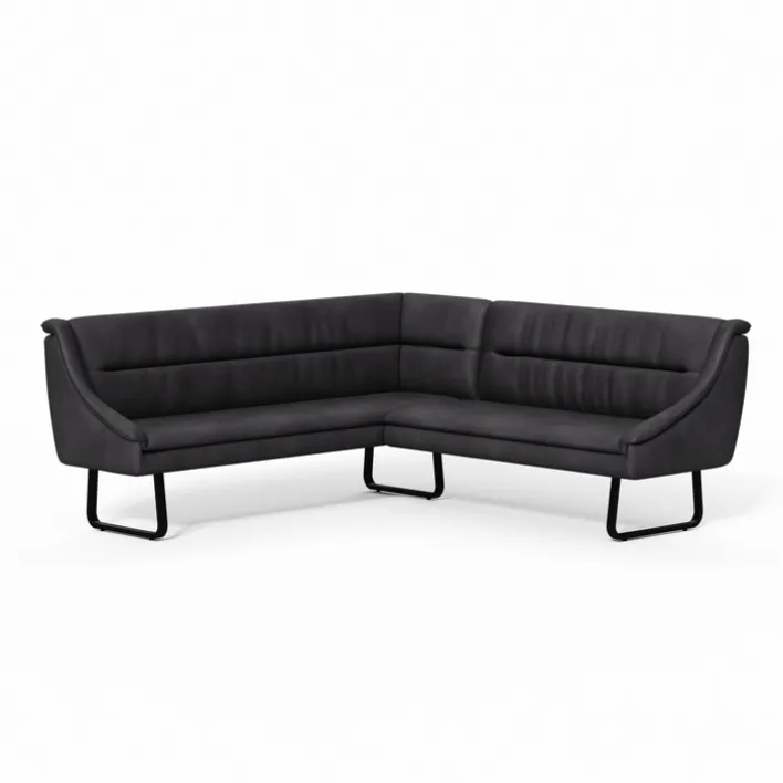 Das Kufengestell aus Metall in Schwarz unterstreicht den modernen Stil und bietet einen stabilen Stand. Die Maße der Eckbank betragen 181 cm in der Länge, 217 cm in der Breite und 84 cm in der Höhe. Die Sitzhöhe liegt ebenfalls bei 84 cm. Mit einem Gewicht von 52,50 kg eignet sich das Möbel besonders für den Esszimmerbereich. Die Armteile sind fest gearbeitet und die gesamte Ausführung wirkt geradlinig und funktional, passend für zeitgemäße Wohnkonzepte.