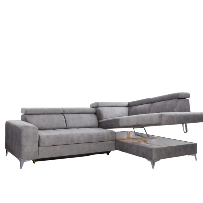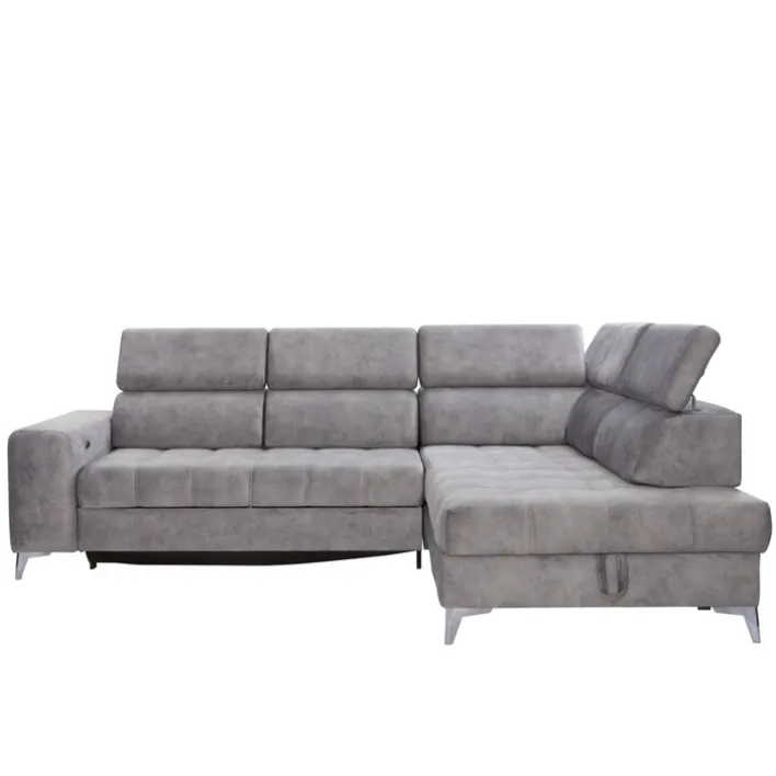 Das graue Ecksofa PRAG besteht aus einer Ottomane rechts und einem 2-Sitzer mit Armteil links. Fünf verstellbare Kopfteile, eine elektrische Sitztiefenverstellung und ein Bettkasten machen die gemütliche Polsterecke zur modernen Wohlfühloase im Wohnzimmer.