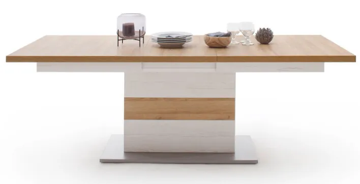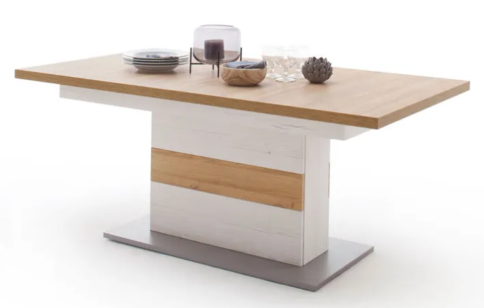 Der Esstisch der Serie CALVA vereint Funktionalität und modernes Design. Mit einer Breite von 100 cm, einer Höhe von 77 cm und einer Länge von 180 cm bietet er ausreichend Platz für gesellige Runden. Bei Bedarf lässt sich der Tisch auf eine maximale Länge von 280 cm erweitern, dank des praktischen Synchronauszugs. Die Hauptfarbe des Tisches ist Braun, ergänzt durch silberfarbene und weiße Akzente, die dem Tisch ein elegantes Erscheinungsbild verleihen. Der Farbton Pinie Aurelio harmoniert perfekt mit den weißen und aluminiumfarbenen Elementen.
