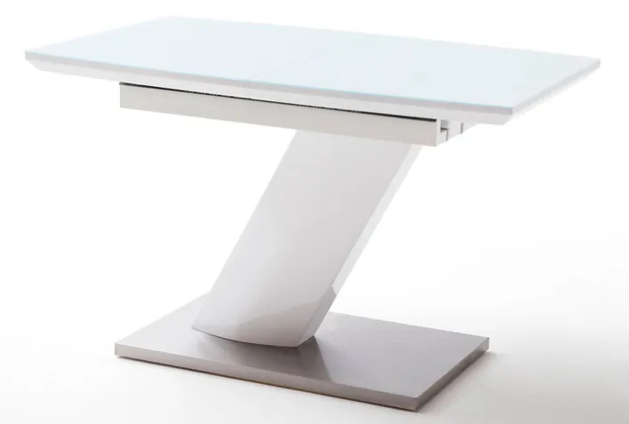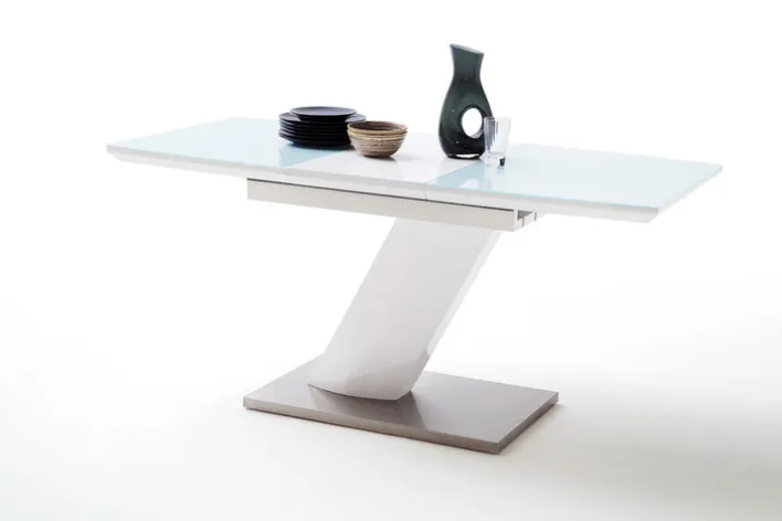 Der moderne Esstisch HOLLY mit Einlegeplatte sollte in den Innenbereichen des Hauses platziert werden und besteht aus einem Materialienverbund aus Glas, Holznachbildung und Metall. Da die MDF-Platte mit Sicherheitsglas verstärkt ist und die Bodenplatte mit den Maßen 91 x 50 x 5 cm aus hochwertigem Edelstahl gefertigt ist, ist der Tisch mit der in Hochglanz Weiß lackierten Säule besonders stabil und widerstandsfähig.