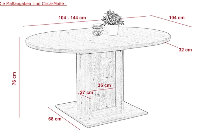 Breite: 104 cmHöhe: 76 cmLänge: 104 cmGewicht: 49,60 kgTischlänge max. bei Auszug/Erweiterung: 144 cm