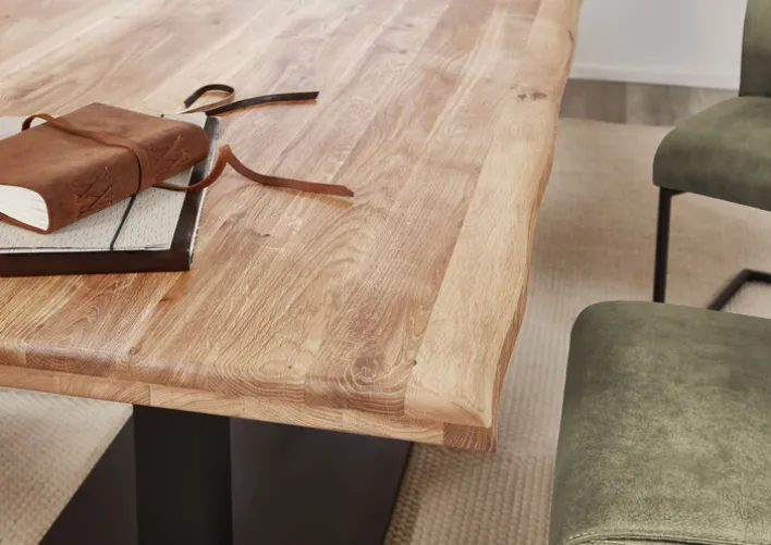 Der Esstisch aus der Serie TARVOS vereint modernes Design mit hochwertigen Materialien. Die Tischplatte aus massiver Eiche besticht durch ihre natürliche Holzmaserung und verleiht jedem Raum eine warme Atmosphäre. Mit einer Breite von 100 cm und einer Länge von 200 cm bietet der Tisch ausreichend Platz für gesellige Runden. Die rechteckige Form des Tisches passt sich dabei harmonisch in verschiedene Wohnstile ein.