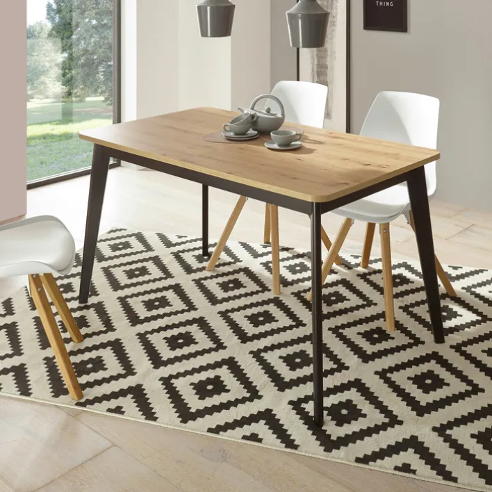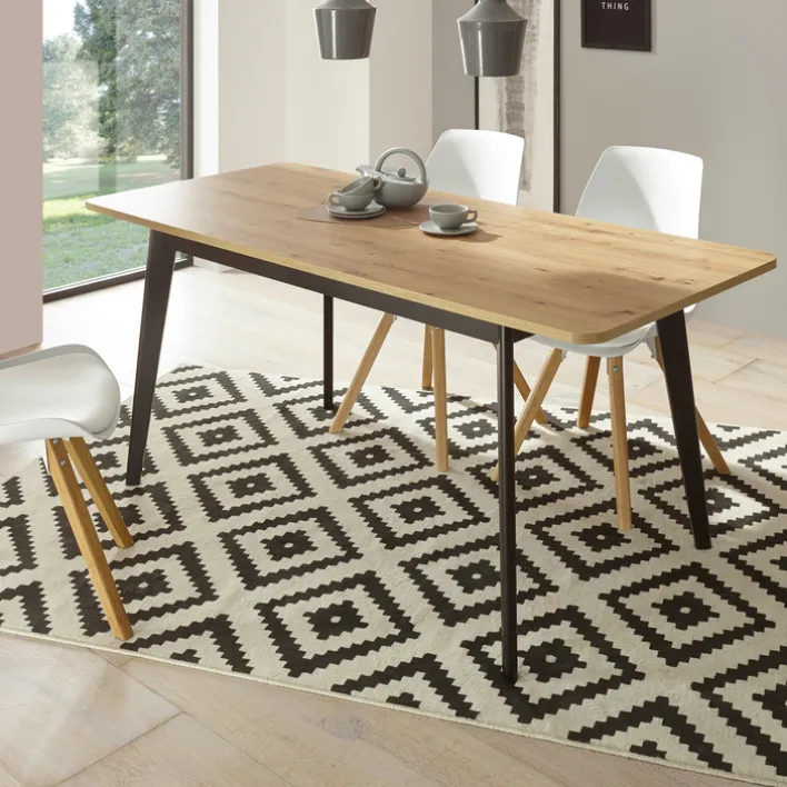 Der ausziehbare Esstisch TORGE mit Tischplatte in Eiche Artisan Dekor und Vierfußgestell aus schwarz lackiertem Echtholz zeichnet sich durch eine skandinavische Leichtigkeit und funktionale Vielseitigkeit aus. Mit dem praktischen Gestellauszug lässt er sich von 140 auf 180 cm verlängern.