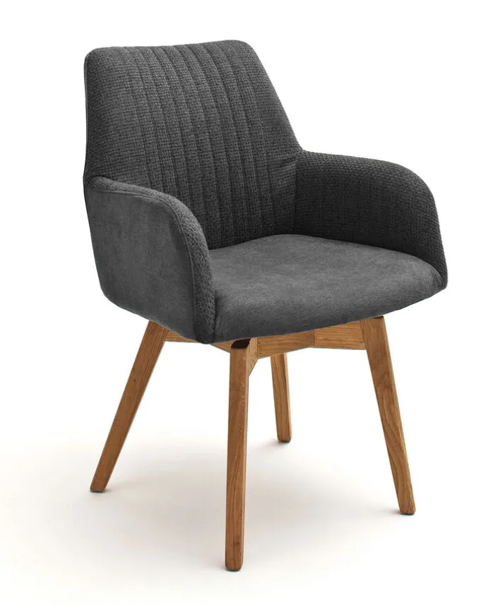 Dieser Stuhl, der ein Vierfußgestell aus geölter massiver Wildeiche hat sowie mit einem Stoffbezug im Sitzbereich versehen ist, sorgt auch dank der festen Armteile für ein bequemes Sitzen am Tisch. Er hat eine Breite von 59 cm, eine Höhe von 87 cm sowie eine Tiefe von 61 cm. Er überzeugt zudem damit, dass er um 180 Grad drehbar ist, so dass man nicht unbedingt aufstehen muss, wenn man die Blickrichtung verändern will. Außerdem fällt positiv auf, dass er über eine praktische Rückstellfunktion verfügt.