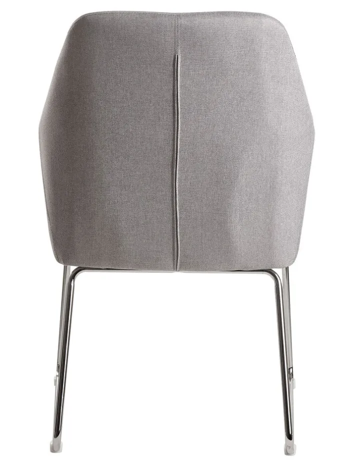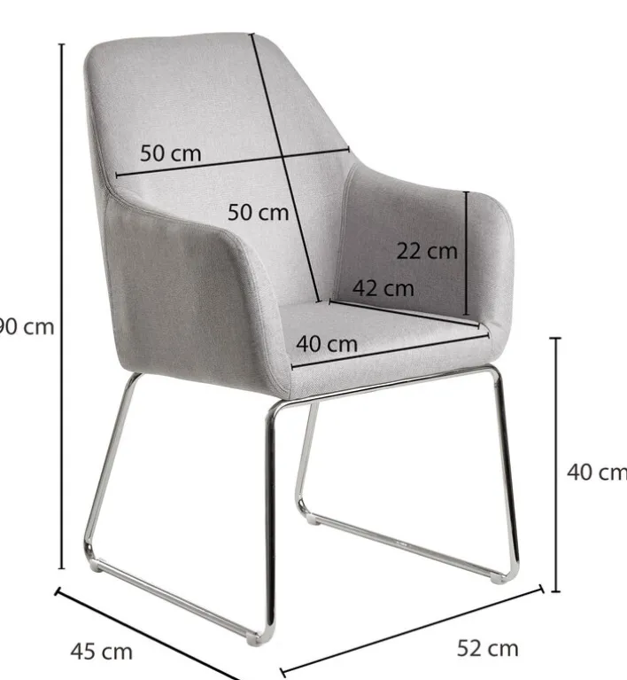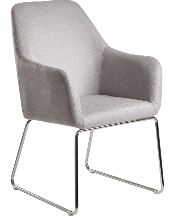 Der Hersteller platziert die Sitzschale des mit hellgrauem Stoff bezogenen, gepolsterten Stuhls auf einem Kufengestell aus silberfarbigem Stahl. Der Esszimmerstuhl ist mit angenehmen Armlehnen versehen und bis 110 Kilogramm belastbar.